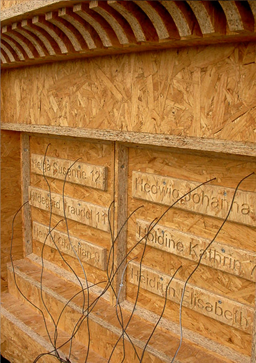 I first came across the photograph of Helga Susanne, Hildegard Traudel, Helmut Christian, Holdine Kathrin, Hedwig Johanna, and Heidrun Elisabeth by chance, when leafing through an old and rather dishevelled copy of the magazine `Der Spiegel“ that had been left on a bench in a disused office. The sudden appearance of the children in the corner of the magazine“s page was deeply affecting, and this artwork, so far as I can now discern, was an attempt to somehow publicly respond to that initial sensation of shock and disturbance. As the artwork developed, I tried hard to consider what role visual representation can play within the difficult terrain of political symbolism and child-victim imagery. That said, in retrospect I feel that the photograph and both its emotional and historical charge was simply far too large for me to contend with. I do hope, nonetheless, that this artwork and the many difficulties I still attach to it can in some way reflect the very unsettling reality of child-victim imagery, where the impossibility of looking upon images of child-victims as closed-off objects for passive viewing becomes quite apparent.